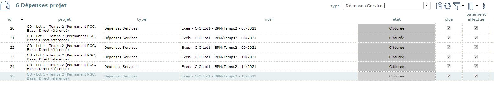 - For each, I have modified the values and dates, and set paid, then registrered, then closed it.