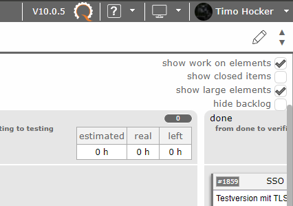 The settings in the top right of the kanban view are not getting saved. When I disable "show work on elements" it becomes enabled again once I log out and back in.