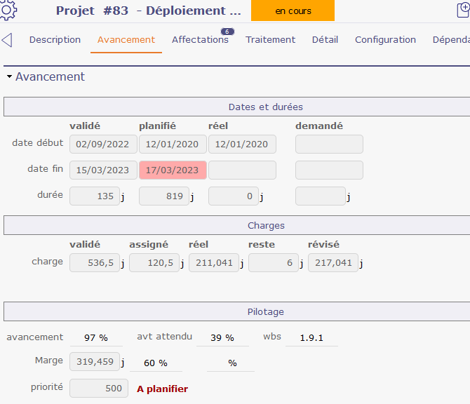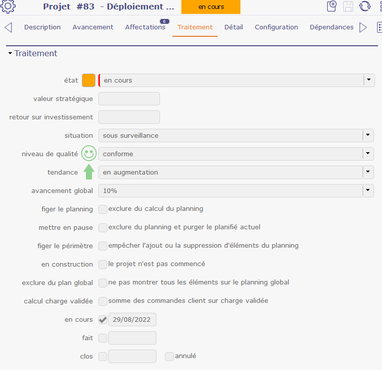I have no possibility to change any project information (All fields in grey, status "en cours").