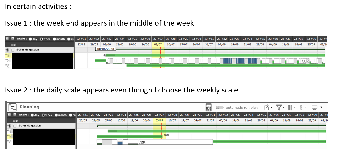 I'm using the 10.3.6 version. In the Gantt Planning, I have detected an issue. When I select the weekly scale, I see the daily scale when I right click on certain activities or I see the weekly scale but out of sync with the timeline above. This is an issue because I cannot properly visualize the real and planified work. (See the screenshots below to understand my problem).