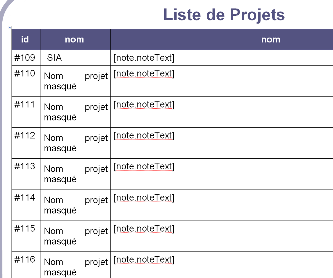 I'm trying to do the same for a list of project (to produce synthetic view of manager's view of projects), but when i'm working with list of insteed of details, [note.noteText] was not disponible (field is not interpreted).