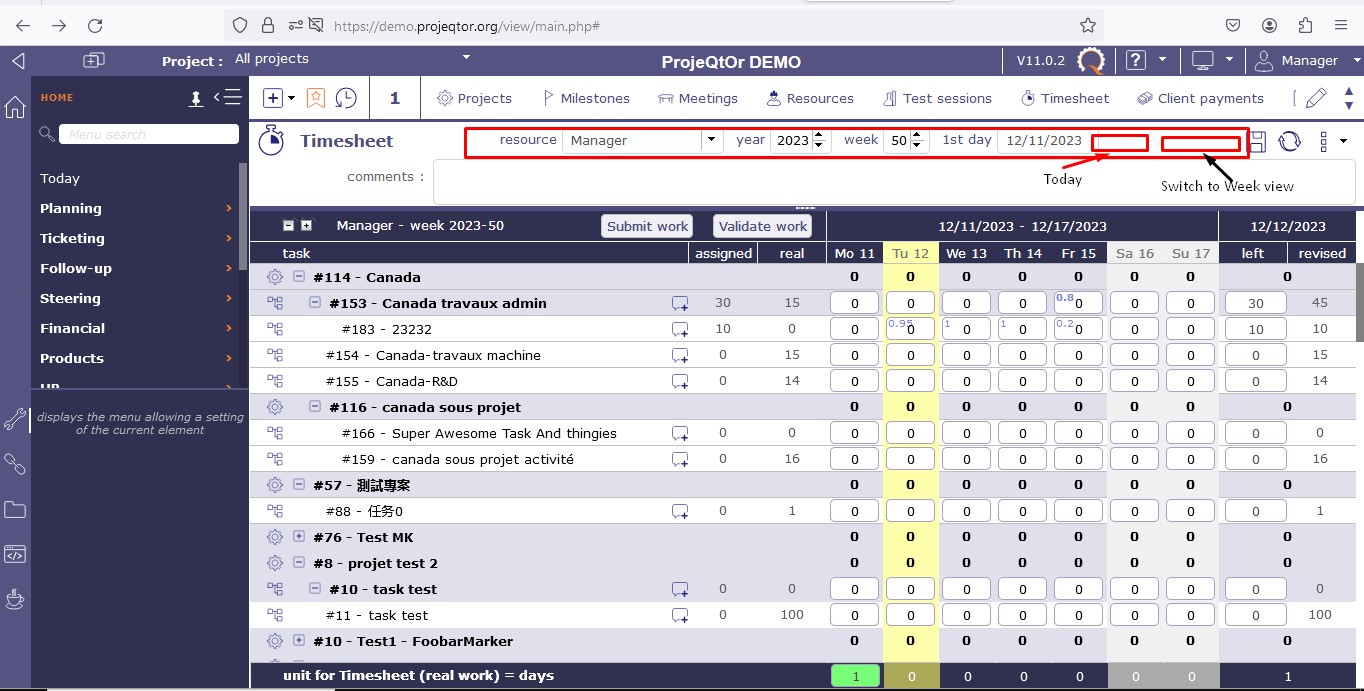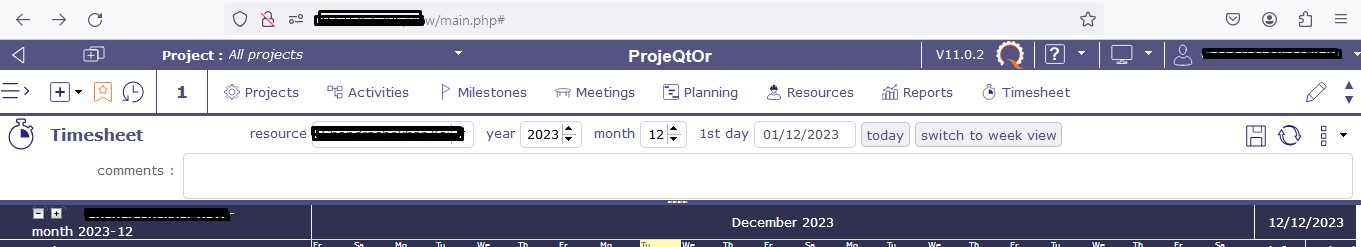 I've noticed a concerning issue while using the timesheet feature in ProjeQtOr. The "Today" and "Switch to week view" options are not visible on the top right corner of the timesheet, as highlighted in the attached screenshot.