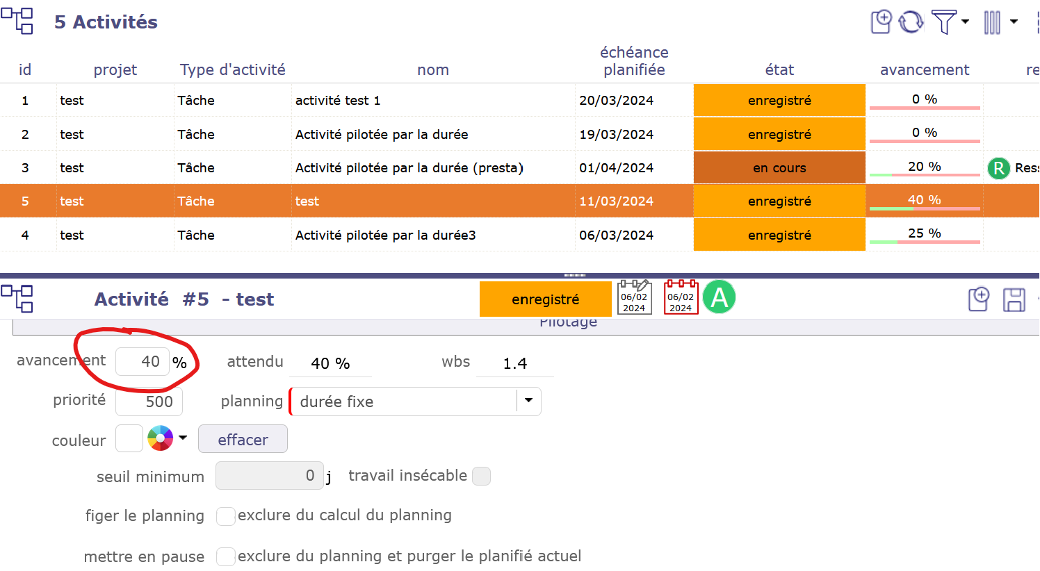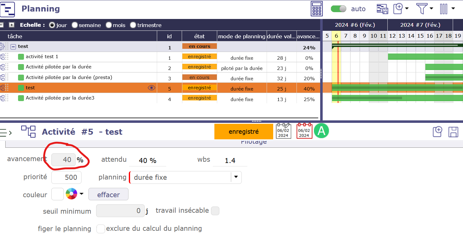 with an activity set "fixed duration", charge set and no assignation, i can't change avacement value in planning view.