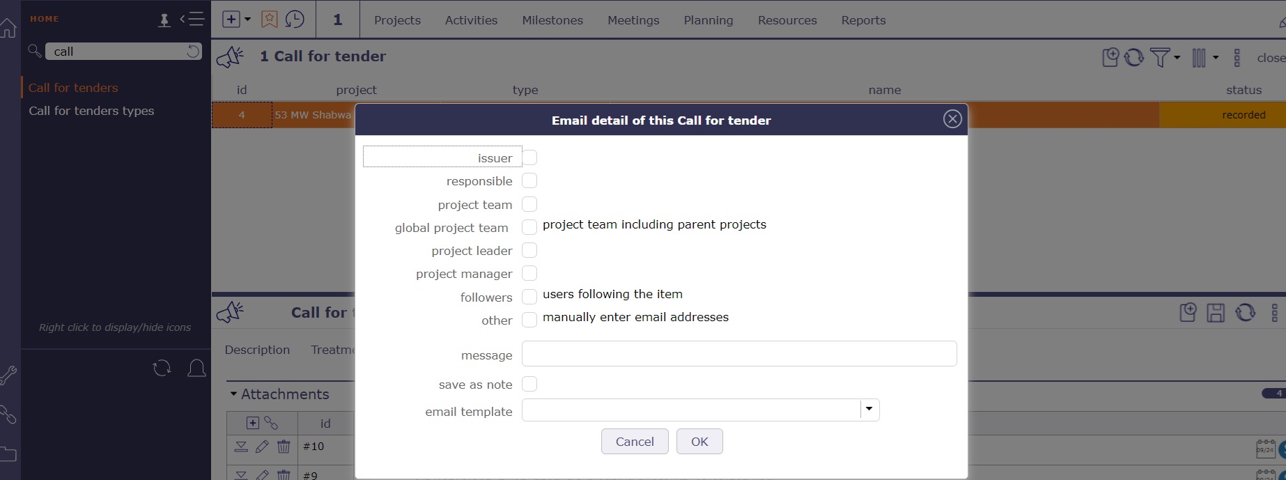 When i am going to email "call for tenders" there is no option to attach files. please check screenshot.