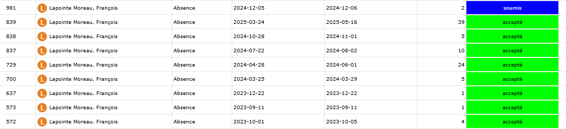 Here is the list of Leave Period for user Francois Lapointe Moreau