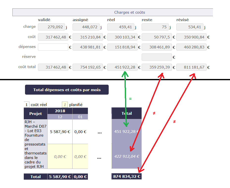 I don't figure out why there is a difference between what the charges and cost of my project table shows (811 181,67€, which for me seems right) and what the "Total expenses and costs per month" report calculate (874 834,52€, which for me is wrong).