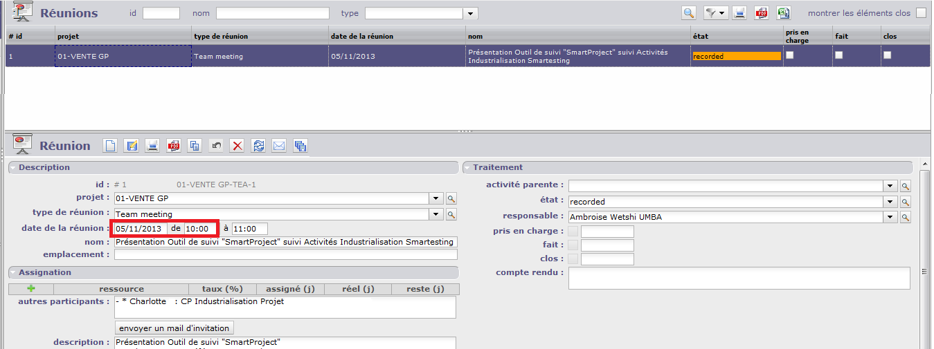 The thing that is really strange is that before I created this meeting, there was not end date of the project. But when I recorded the date of the meeting, I wanted to check if the meeting was clearly visible on the connection of the person responsible of the meeting.