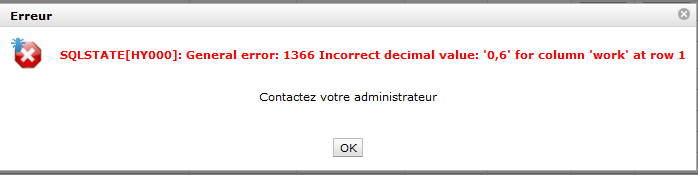 First I changed MySQL configuration so as to prevent incorrect data being saved in the database (STRICT_ALL_TABLES) because I suspected this was related to a comma/point issue as we were using the french language and the issue only happened with decimal numbers. From there on, we got the attached eror message from Projeqtor when things were going bad. At least the database was not corrupted and we could retry the data update until we succeeded.