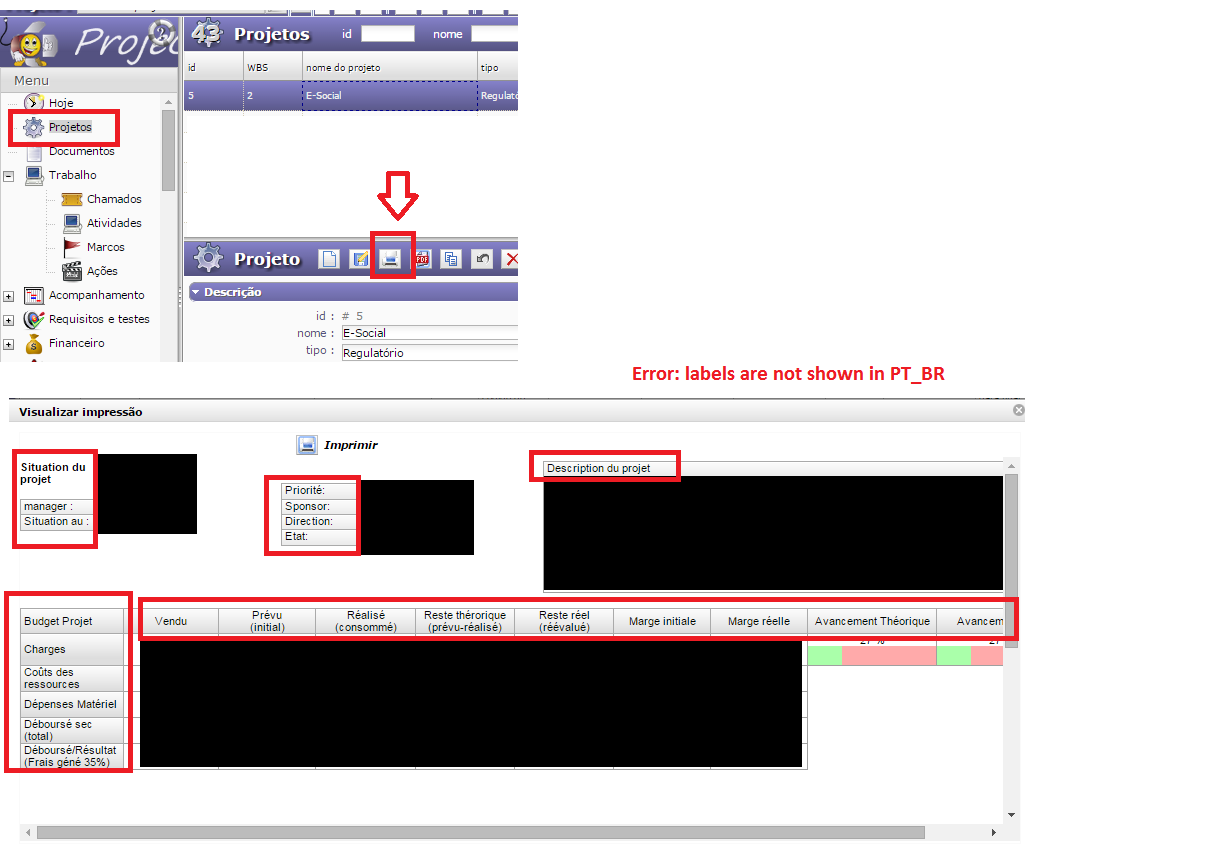- Printing record with problems related to language shown. Application is in PT_BR and labels are shown in French. it seems to happen only on project screen, since other screens are working. Please see attached file "Printing error".