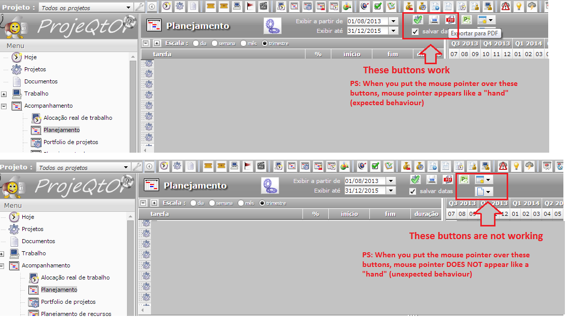 After I've updated to version 4.5.5, there are three buttons in screen "Planning", there are not working. The buttons are "export to MSProject", "Column selection" and "new item - activity, project, milestone". Please see the attached file.