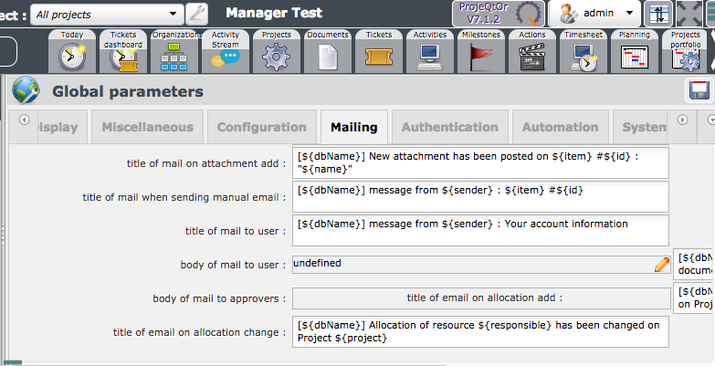ProjeQtOr free project management software - version 7.1.2 - Global Parameters - Mailing section - Form INPUT issue - ProjeQtOr
