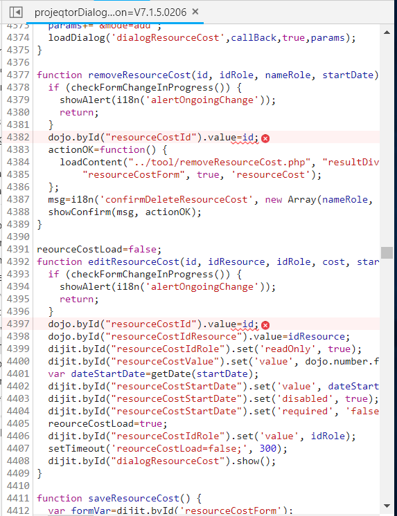 I checked version 7.1.4 : no line can generate issue on projeqtorDialog.js.