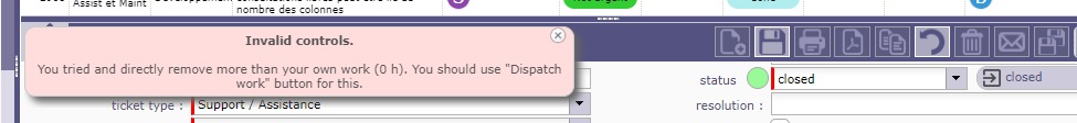 External Project Leader receives this error message : You tried and directly remove more than your own work (0 h). You should use "Dispatch work" button for this.