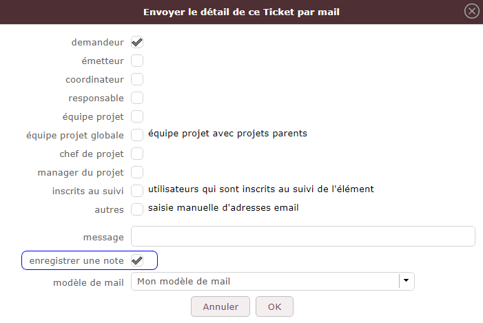 When manually sending an email using an email template, for example from a ticket, it is possible to check the "record a note" box (see below).