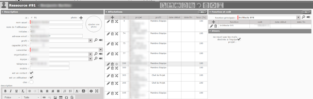 For example, in the screen "Ressource", we ca see all the projects affected to a ressource