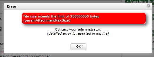 I have "attachments max size" under Parameters/Global Options set to 250000000.
