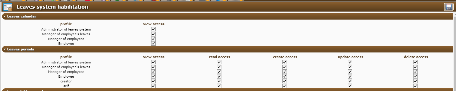 5) I have a new problem. All habilitation are selected (except Deleted) on Leaves system habilitation for all the profiles Administrator of leaves system