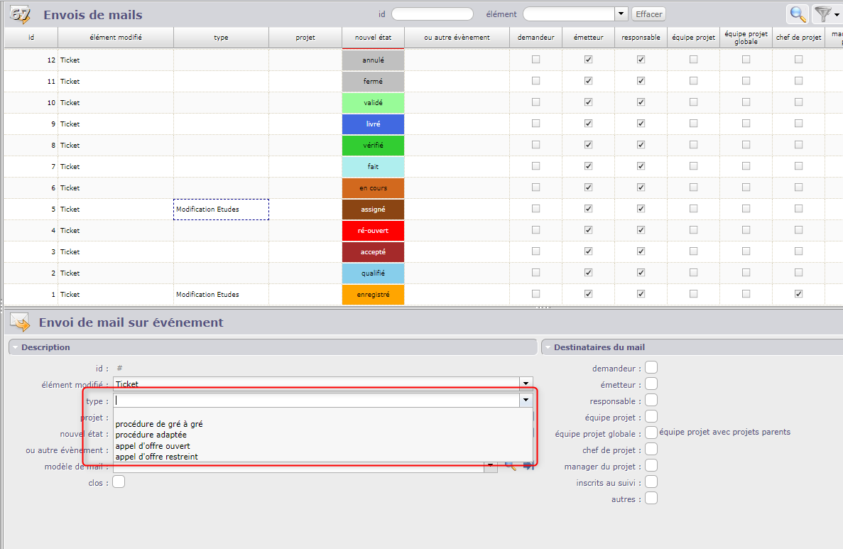 In my example, I try to create send email for ticket element, and the type should be like in screen 1,but the type are like in screen 2.