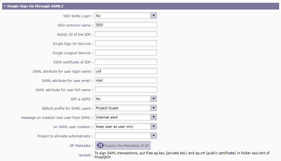 - enter the xml definition of Projeqtor SP in your IDP