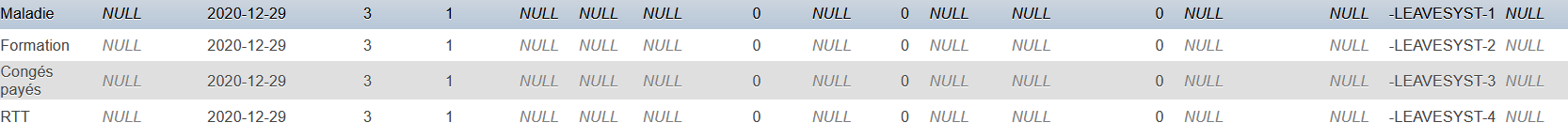2) I created leave types in "parameters --> leave period parameters --> type of leave". As I'm french, I created CP, RTT and so on. (picture 1)