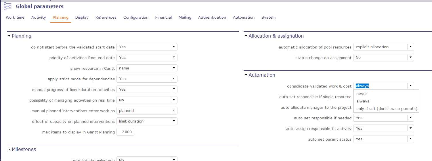 If you really want to reset the project cost, you may need (connected as an admin) to modifiy an option in : Global parameters/Planning/Automation