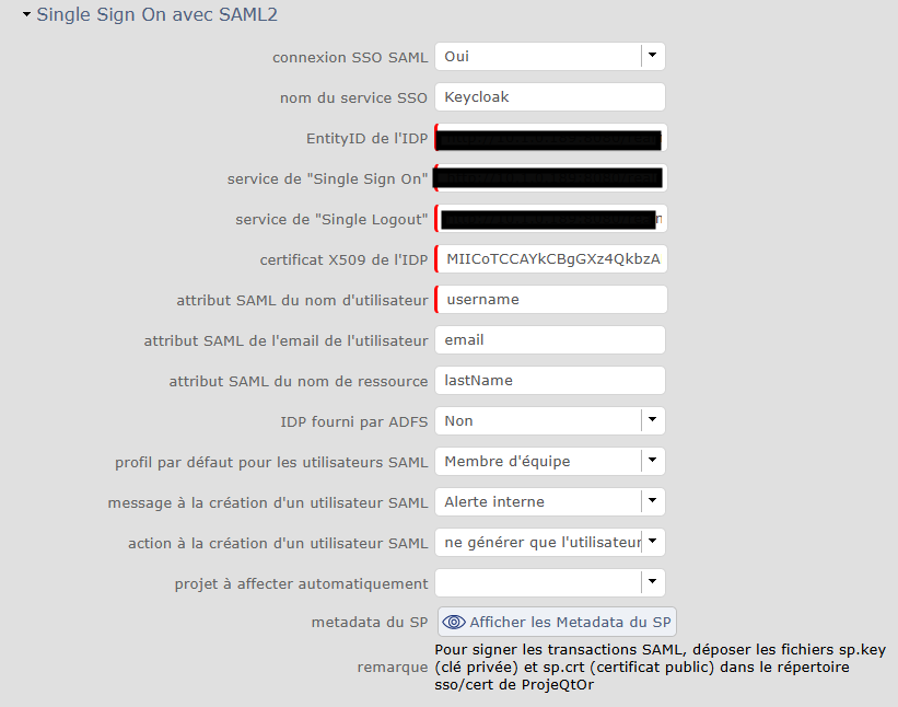 • In ProjeQtOr, I filled in the SSO SAML2 fields under global parameters.