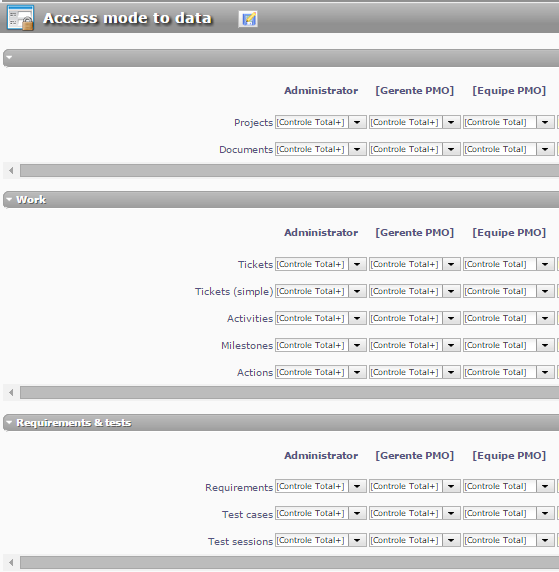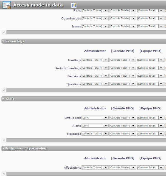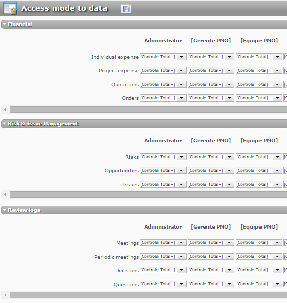 3. For the profile "Equipe PMO", in access mode to data screen, all items are configured with the access mode "controle total" (see pictures "access mode to data - 1/2/3.png"