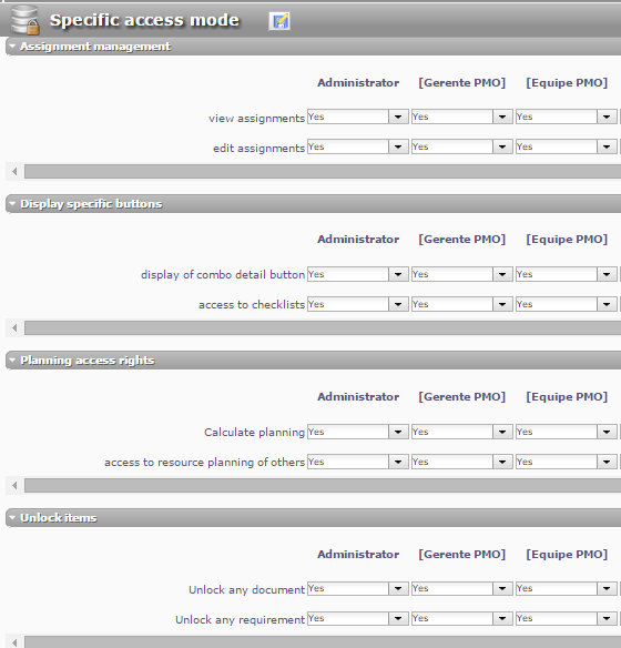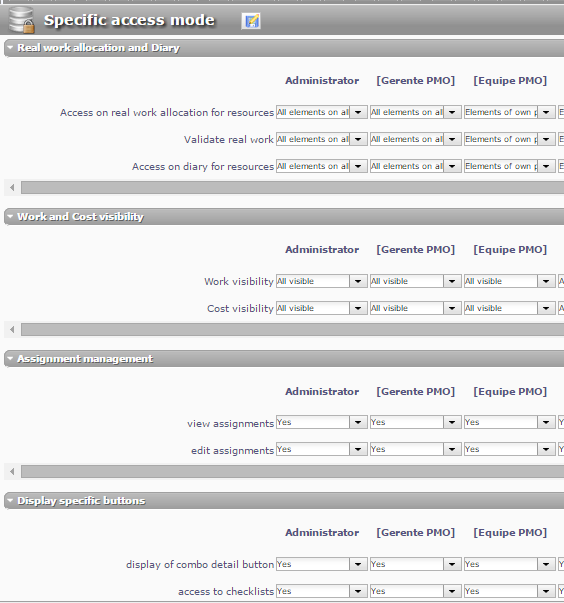 4. For the profile "Equipe PMO", in specific access mode screen, all items are configured to see only items from its own projects (see pictures "specific access mode - 1/2.png"