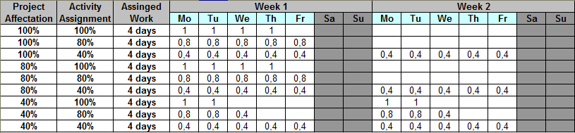 No.If I mix, I affect 80% on the project screen and if I affect on the task 40%, so the ressource will work 0.4 day during 4 days every week.