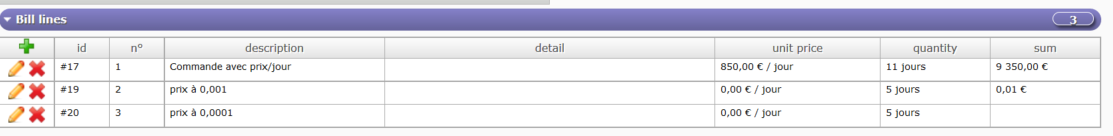 fix a price of 0,0001 per day : the work is also not correct in project (and the price in bill line doesn't appear (image 5)