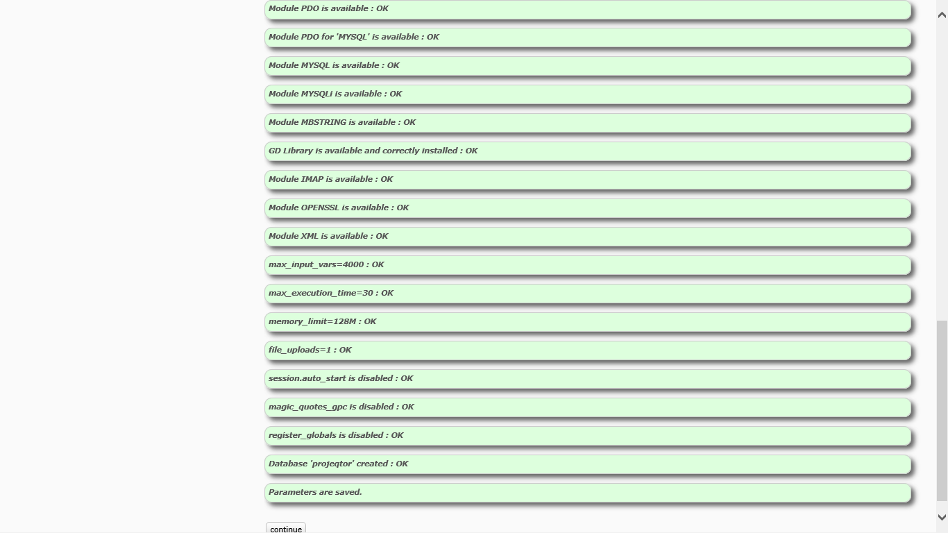 3. I get a successful configuration (all messages in green background color) and then I press on "Continue".