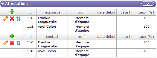 If I create an affectation via the "Affectation" screen, it works and the affectation appears on the project screen (I knew already)