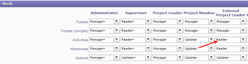 But which right (which line) must I modify in the column "External project manager" ? I have modified many, but still no line "work :" appearing...