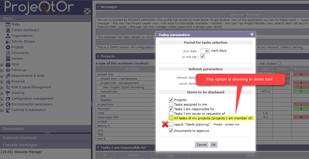 ProjeQtOr free project management software - How to bring up 'All tasks of my Projects' option in today dashboard screen - ProjeQtOr