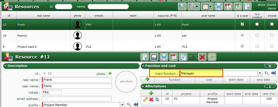 If a resource is created via the 'User ' menu, with 'is a resource' checked, there is no "main function" selected by default.