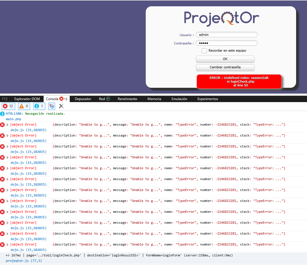 I'm trying to install Projeqtor 5.2.4 in a hosting service. I've created the database and set the file permissions. But when I try to access with admin/admin I receive a undefined error. The log file say: