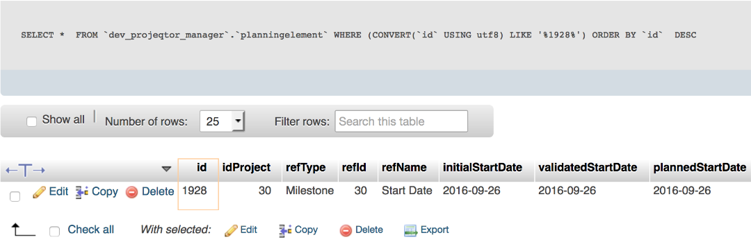 So when I looked for the ID shown in the Diary screen, i found it in the "planningelement" table, see the screenshot below.