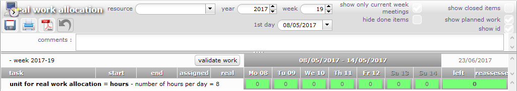 As the screenshot shows, if there is no work in the week, the summary line is shown with green background.