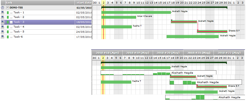 However, during the testing, I noticed that tasks for a resource were overlapping. This was unusual, so I investigated by right-clicking on each task. I found that the resource (Akshath Hegde) was assigned 100% to each task, yet ProjeQtor split his daily hours among three tasks.