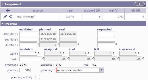 Assigned to activity with 5 assigned days, 1 real day, real cost of activity is 100€