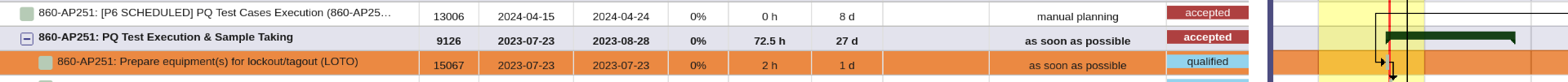Please see attachment. I setup Start-Start between 860-AP251: [P6 SCHEDULED] PQ Test Cases Execution (860-AP251.SP) and 860-AP251: Prepare equipment(s) for lockout/tagout (LOTO). The 860-AP251: [P6 SCHEDULED] ... (Manual planning) is a placeholder for the activity to execute. Whilst running the planning calculator, 860-AP251: Prepare equipment(s) ... (as soon as possible) start before. What should be the correct setup to have both always in sync ?
