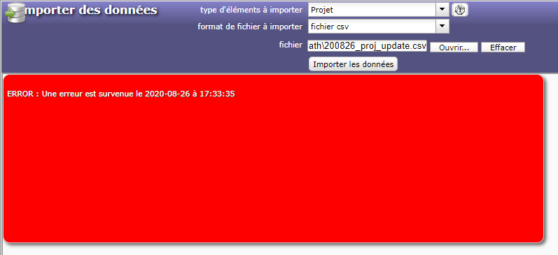 I try to update a unique field in project elements. I prepare a csv and xlsx file with only 2 columns : Id and contractCode. As I try to import, an error is raised.