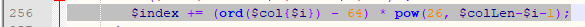 $index += (ord($col[$i]) - 64) * pow(26, $colLen-$i-1);
