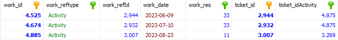 Query indicates every booked work, independant from refType, as a ticket. So you get results, if there is some ticket with id of a reference, having referenced any activity.