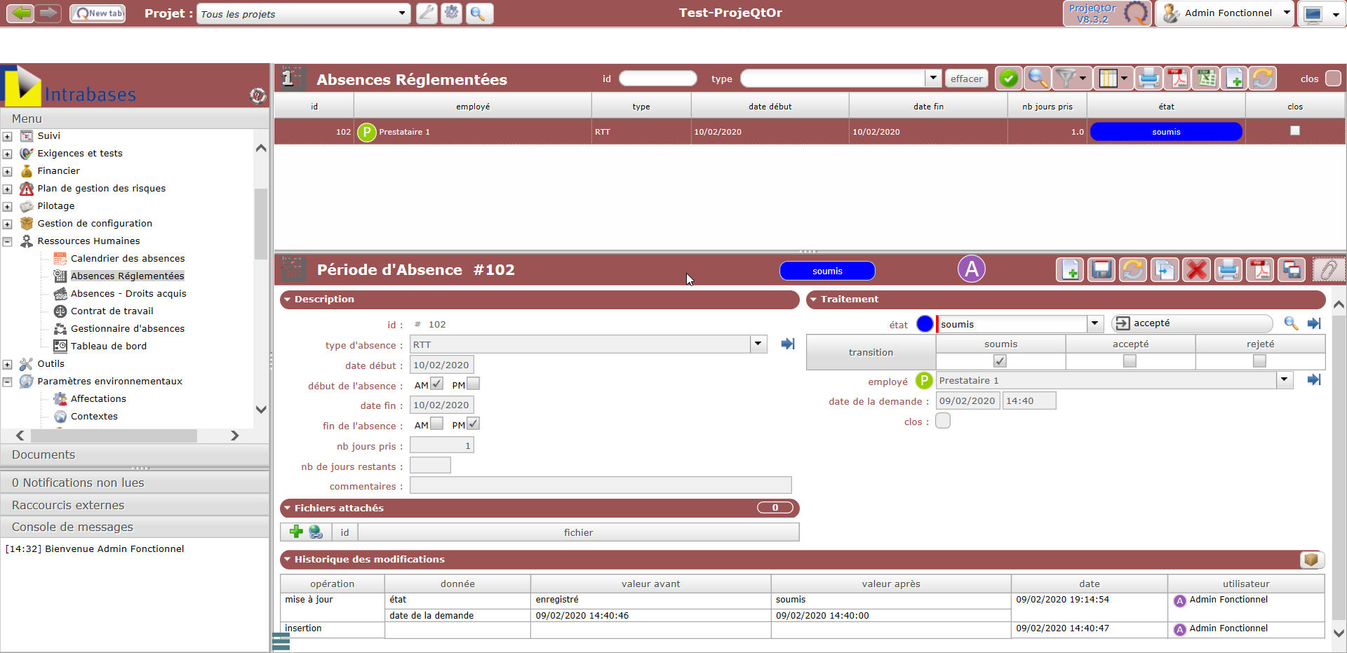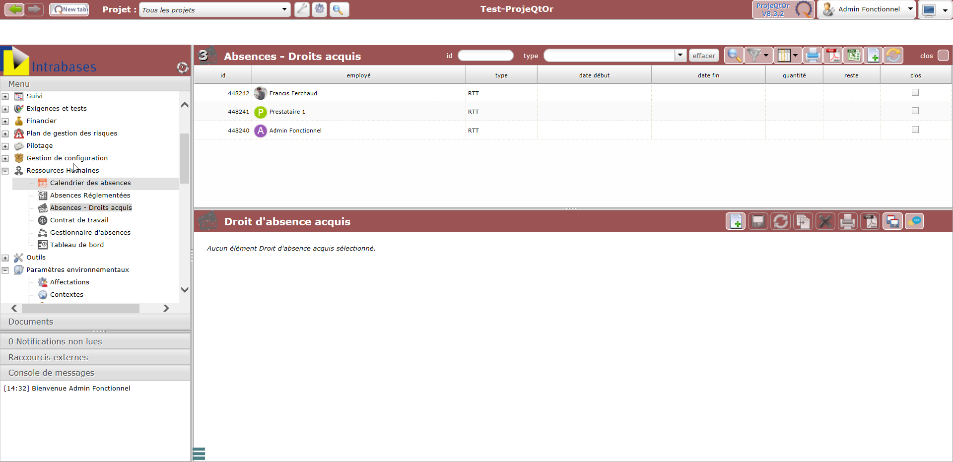 All the lines have quantity and left quantity empty, but if I don't delete those rights, he's able to declare leave periods, but as I delete them, he gets an error which is logic, but I thought it would be even more logic that he couldn't only see the types of leaves for which he has rights, in the leaves absence creation screen.