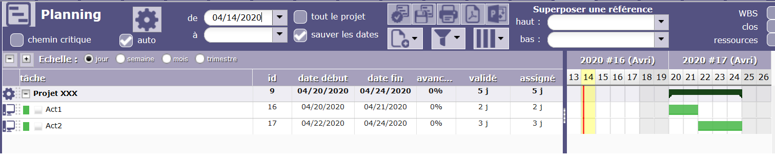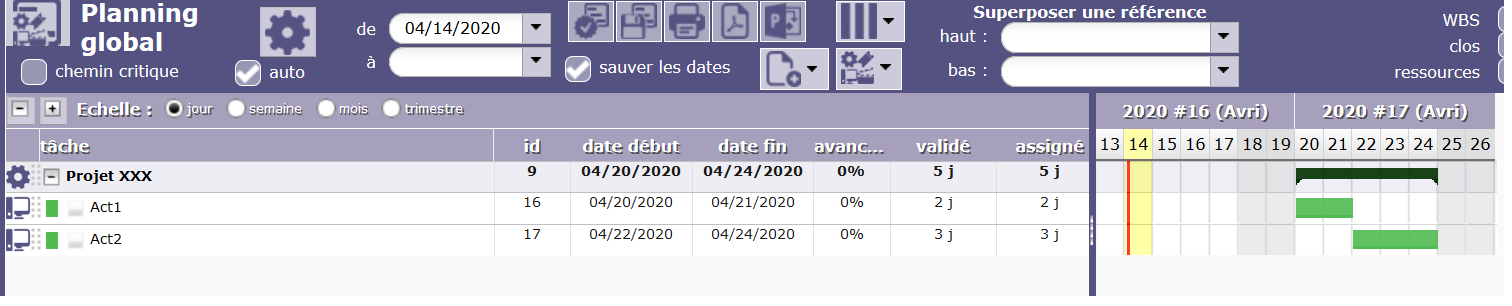 In the Ressource Planning view, i can see my ressource and the activity but i cannot see the start date of my activity and so the planification