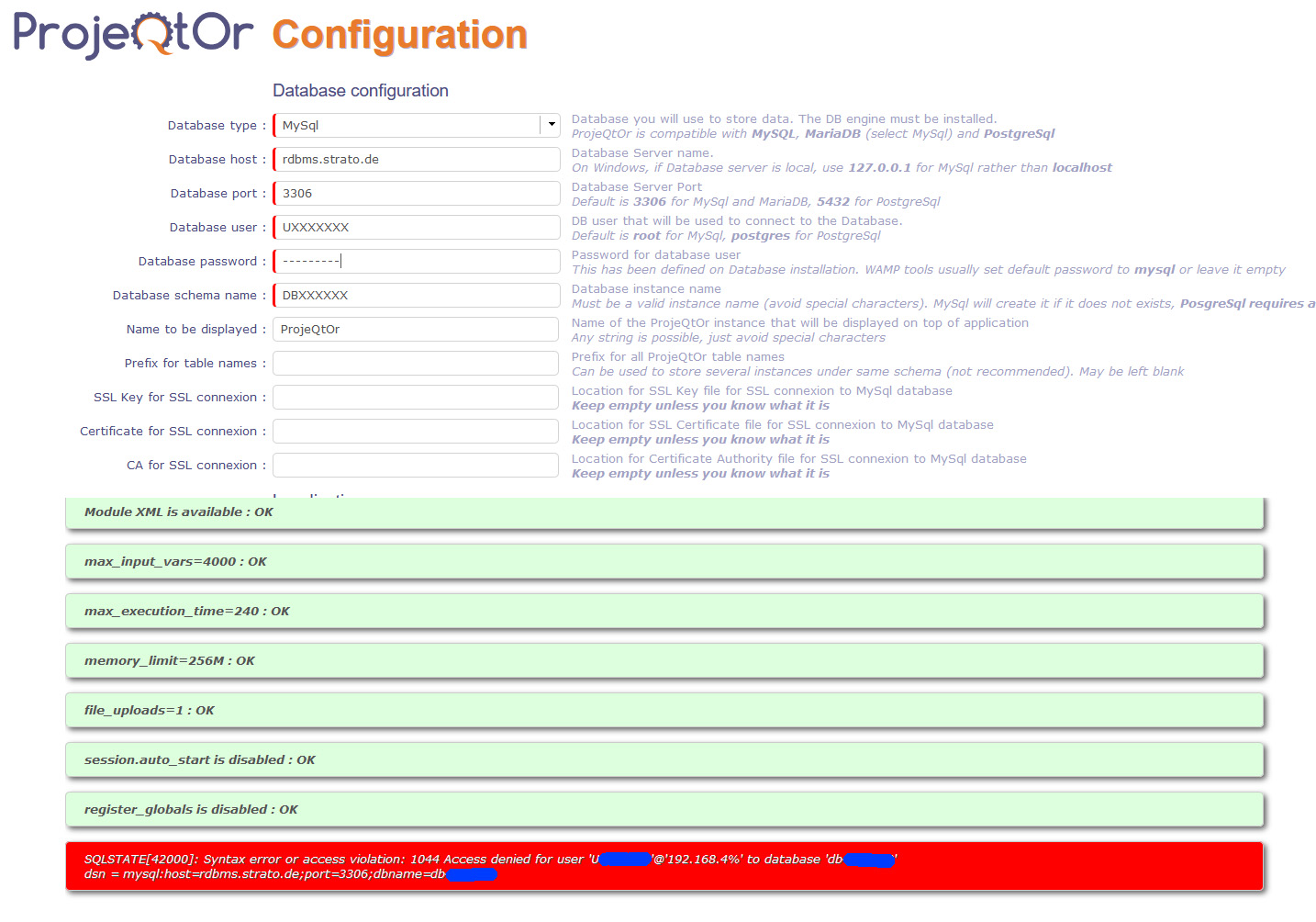 Error message is : SQLSTATE[28000] [1045] Access denied for user 'UXXXXXX'@'radomix.store.d0m.de' (using password: YES)