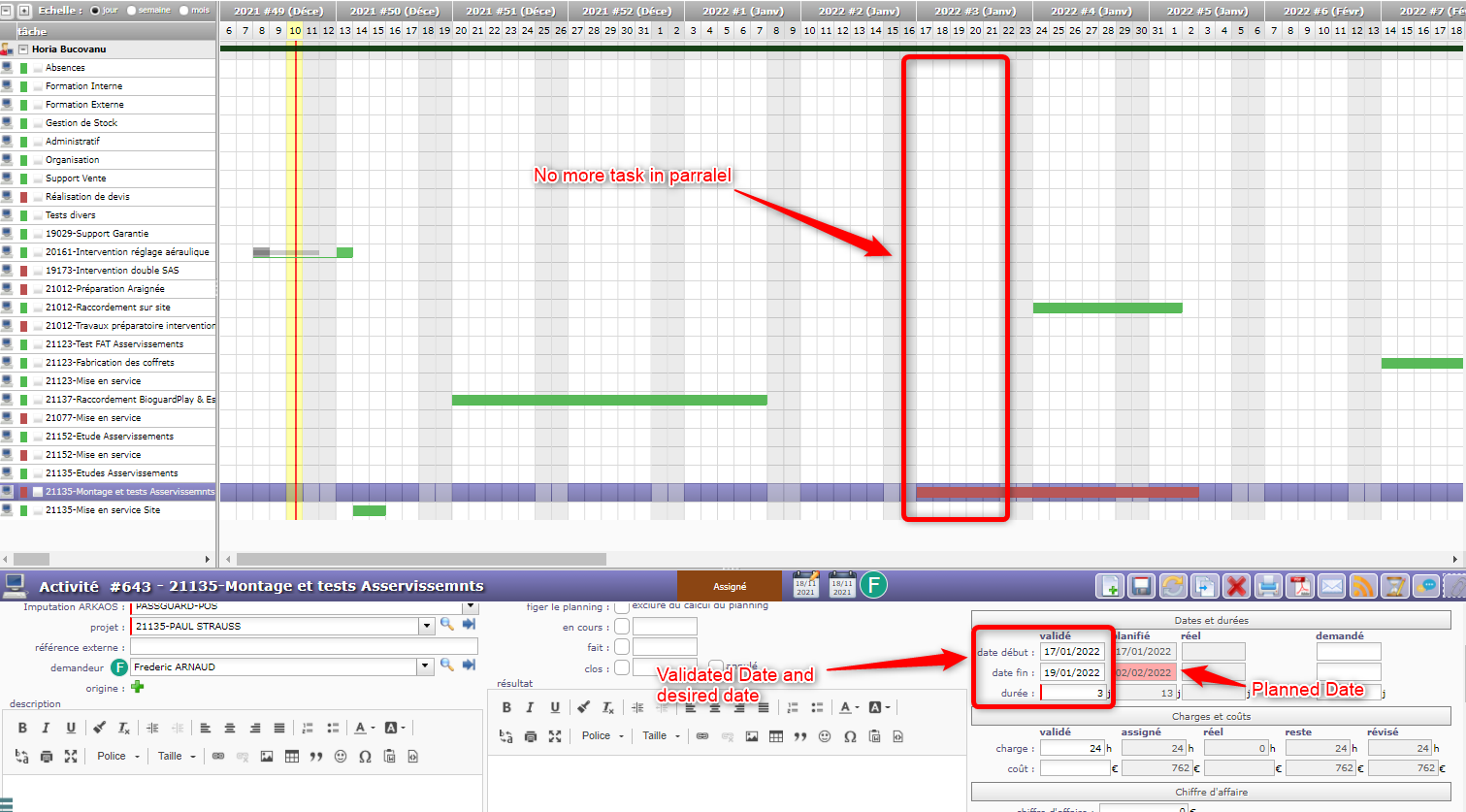 Valided dates is a wish you have to compare with the planified dates calculated by the application with all constraints you gave to it