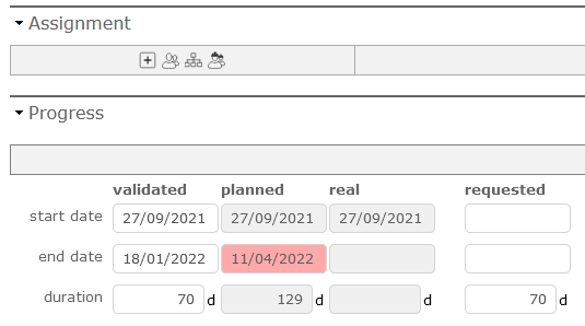 So when you enter 70 days in the "validated", the software tells you that with the data you gave it, this date is not possible to keep, it therefore turns red and plans the best while respecting the workload.
