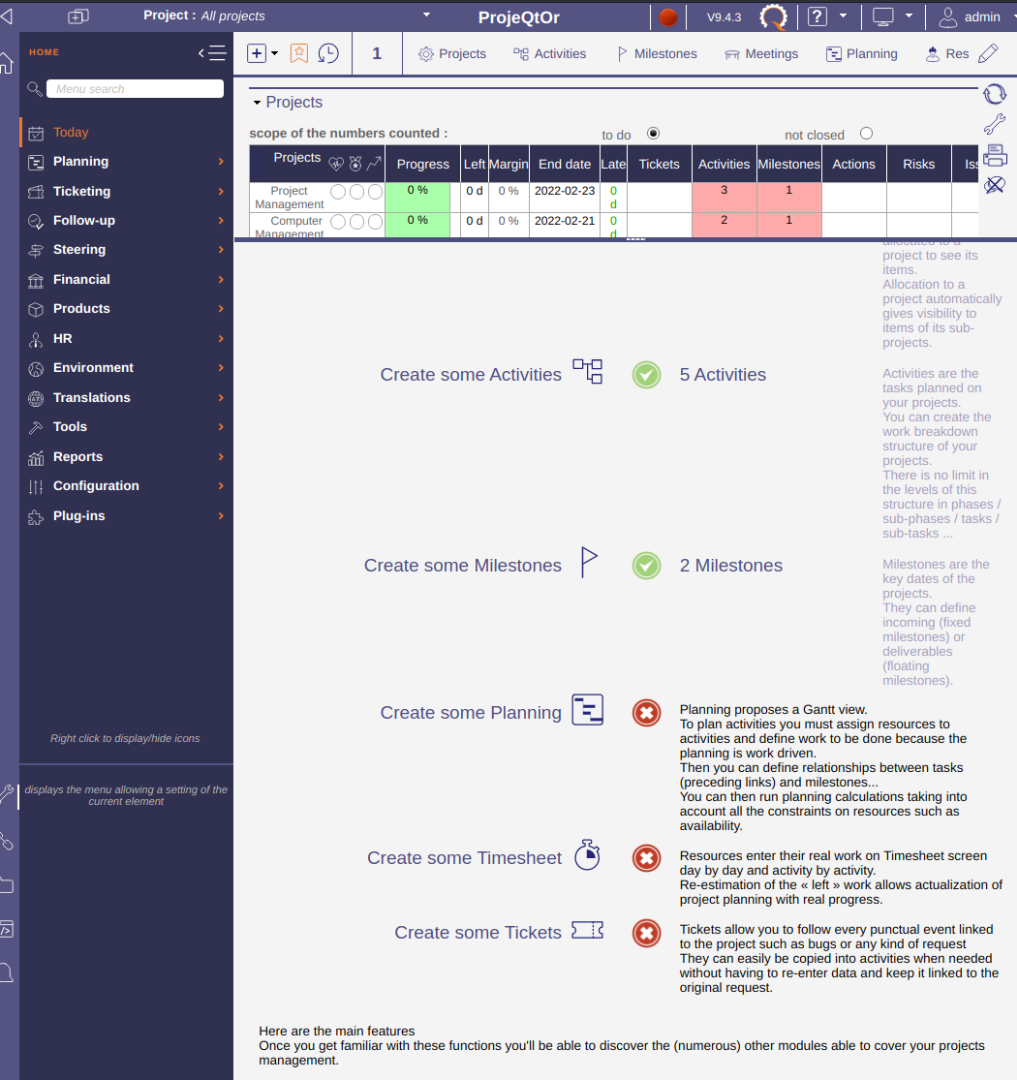 I am working through the "Start Guide" in a brand new ProjeQtOr V9.4.3 install. I've made some example clients, contacts, resources, users, projects, allocations, activities, and milestones. I'm just walking through this with some simple placeholders just to understand the software before I start with something real. So far so good, and it says my progress is 73%. This is great, it's a wonderful introduction to the features of the program, and even though I'm familiar with PM in general, I really appreciate how it walks through the steps so I can see how it works with this software!